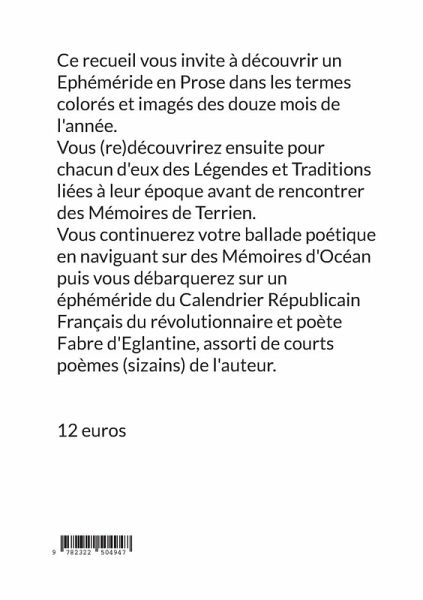 Ce recueil vous invite à découvrir un Ephéméride en Prose dans les termes colorés et imagés des douze mois de l'année.Vous (re)découvrirez ensuite pour chacun d'eux des Légendes et Traditions liées à leur époque avant de rencontrer des Mémoires de Terrien.Vous continuerez votre ballade poétique en naviguant sur des Mémoires d'Océan puis vous débarquerez sur un éphéméride du Calendrier Républicain Français du révolutionnaire et poète Fabre d'Eglantine, assorti de courts poèmes (sizains) de l'auteur.