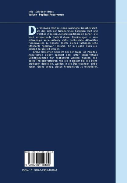 Die Varikose zählt zu einem wichtigen Krankheitsbild, um das sich der Gefäßchirurg bemühen muß und welches in seinen Zuständigkeitsbereich gehört. Die dazu notwendigen fachspezifischen Standards operativer Therapie stellt dieses Buch eingehend dar. Unklarheit herrscht bei der Frage, ob Popliteaaneurysmen elektiv operiert oder unter konservativen Gesichtspunkten nur beobachtet werden müssen. Moderne Therapieverfahren, wie sie in diesem Fall die Stentprothesen darstellen, werden in die Überlegungen einbezogen. Grund genug, diesen Problemkreis zu diskutieren.