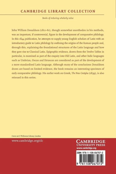 John William Donaldson (1811-61), though somewhat unorthodox in his methods, was an important, if controversial, figure in the development of comparative philology. In this 1844 publication, he attempts to supply young English scholars of Latin with an introductory guide to Latin philology by outlining the origins of the Roman people and, through this, explaining the foundational structures of the Latin language and how they gave rise to Classical Latin. Epigraphic evidence, drawn from the Twelve Tables in particular, is examined as part of the enquiry into Old Latin, and other Italic languages such as Umbrian, Oscan and Etruscan are considered as part of the development of a more standardised Latin language. Although many of the conclusions Donaldson draws are based on limited evidence, the book remains an interesting specimen of early comparative philology. His earlier work on Greek, The New Cratylus (1839), is also reissued in this series.
