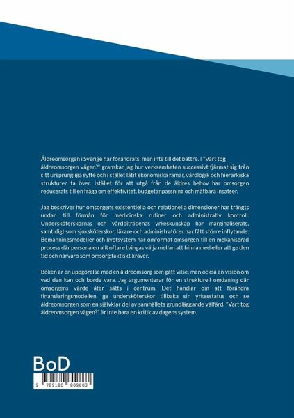 Äldreomsorgen i Sverige har förändrats, men inte till det bättre. I "Vart tog äldreomsorgen vägen?" granskar jag hur verksamheten successivt fjärmat sig från sitt ursprungliga syfte och i stället låtit ekonomiska ramar, vårdlogik och hierarkiska strukturer ta över. Istället för att utgå från de äldres behov har omsorgen reducerats till en fråga om effektivitet, budgetanpassning och mätbara insatser. Jag beskriver hur omsorgens existentiella och relationella dimensioner har trängts undan till förmån för medicinska rutiner och administrativ kontroll. Undersköterskornas och vårdbiträdenas yrkeskunskap har marginaliserats, samtidigt som sjuksköterskor, läkare och administratörer har fått större inflytande. Bemanningsmodeller och kvotsystem har omformat omsorgen till en mekaniserad process där personalen allt oftare tvingas välja mellan att hinna med eller att ge den tid och närvaro som omsorg faktiskt kräver. Boken är en uppgörelse med en äldreomsorg som gått vilse, men också en vision om vad den kan och borde vara. Jag argumenterar för en strukturell omdaning där omsorgens värde åter sätts i centrum. Det handlar om att förändra finansieringsmodellen, ge undersköterskor tillbaka sin yrkesstatus och se äldreomsorgen som en självklar del av samhällets grundläggande välfärd. "Vart tog äldreomsorgen vägen?" är inte bara en kritik av dagens system. Det är också en uppmaning att våga förändra, för vi har kunskapen och engagemanget som krävs. Frågan är om vi har modet.
