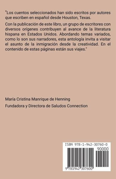 Los cuentos seleccionados han sido escritos por autores que escriben en español desde Houston, Texas. Con la publicación de este libro, un grupo de escritores con diversos orígenes contribuyen al avance de la literatura hispana en Estados Unidos. Abordando temas variados, como lo son sus narradores, esta antología invita a visitar el asunto de la inmigración desde la creatividad. En el contenido de estas páginas están sus viajes. María Cristina Manrique de Henning Saludos Connection