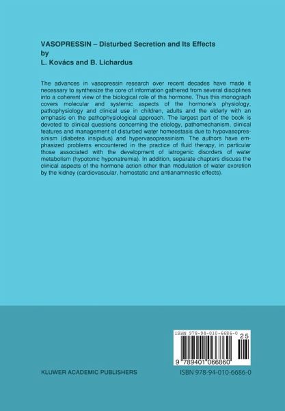 1 Basal mechanisms of water-salt homeostasis.- 1.1 Body water distribution and osmotic concentration.- 1.2 Balance state.- 1.3 Regulation of extracellular fluid volume (the control of sodium balance).- 1.4 Regulation of extracellular fluid osmolality (the control of water balance).- 2 Hypothalamo-neurohypophyseal hormones and neurophysins.- 2.1 Arginine-vasopressin (AVP) and lysine-vasopressin (LVP).- 2.2 Oxytocin (OT).- 2.3 Other naturally occurring nonapeptides in mammals.- 2.4 Neurohypophyseal peptides without established hormonal activity.- 3 Neurosecretion.- 3.1 Neural organization of the vasopressinergic system.- 4 Biosynthesis, transport and release of vasopressin.- 4.1 Structural organization of vasopressin gene.- 4.2 Posttranslational processing of the vasopressin precursor.- 4.3 Regulation of the vasopressin gene expression.- 4.4 The Brattleboro rat - an animal model of hereditary neurogenic (central) diabetes insipidus.- 4.5 Vasopressin release from the neurohypophysis.- 5 Regulation of vasopressin secretion and thirst.- 5.1 Osmoreceptor mediated regulation of vasopressin and thirst.- 5.2 Functional properties of the osmoregulatory system regulating thirst.- 5.3 Functional relationship between osmotically stimulated AVP secretion and thirst.- 5.4 Nonosmotic regulation of vasopressin secretion.- 6 Vasopressin assays.- 6.1 Bioassays.- 6.2 Radioimmunoassays (RIA).- 6.2.1 Vasopressin in plasma.- 6.2.2 Vasopressin in urine.- 6.2.3 Vasopressin in cerebrospinal fluid.- 7 Receptors and synthetic analogs of vasopressin.- 7.1 Vasopressin receptors.- 7.2 Regulation of vasopressin receptors.- 7.3 Synthetic analogs of vasopressin.- 8 Vasopressin and renal regulation of water homeostasis.- 8.1 Renal osmoregulatory performance -the osmotically free water concept.- 8.2Renal actions by which vasopressin may affect the concentration of urine.- 8.3 Urinary concentration.- 8.4 Clinical evaluation of renal concentrating performance.- 8.5 Urine dilution and its disturbances.- 9 Vasopressin in circulatory control.- 9.1 Vasopressin-induced peripheral vasoconstriction.- 9.2 Blood pressure.- 9.3 Effects on the central nervous system.- 9.4 Role of vasopressin in blood pressure maintenance.- 10 Vasopressin and hemostasis.- 10.1 Vasopressin and factor VIII complex.- 10.2 Vasopressin and fibrinolysis.- 10.3 Vasopressin and platelet function.- 10.4 Clinical experience with desmopressin in the treatment of various bleeding disorders.- 11 Vasopressin and anterior pituitary function.- 11.1 Vasopressin and adrenocorticotropic hormone (ACTH) release.- 11.2 Vasopressin and other anterior pituitary hormones.- 12 Vasopressin and brain function.- 12.1 Vasopressin in cerebrospinal fluid.- 12.2 Vasopressin and memory.- 13 Metabolic effects of vasopressin.- 14 Clinical disturbances of vasopressin secretion and effects (hypo- and hyper-vasopressinism).- 14.1 Hypovasopressinism.- 14.2 Hypervasopressinism.- 14.3 Role of water intake and fluid therapy.- 14.4 Iatrogenic disturbances in body water homeostasis.- 15 Ontogenesis of body water homeostasis and vasopressin secretion.- 15.1 Fetal neurohypophyseal function.- 15.2 Vasopressin during the labor.- 15.3 Regulation of body water homeostasis and vasopressin secretion in newborns and young infants.- 15.4 Arginine-vasopressin during the immediate postnatal period.- 15.5 Development of vasopressin secretion from birth to adulthood.- 15.6 Circadian variations of vasopressin secretion and nocturnal enuresis in children.- 16 Renal water handling, vasopressin secretion and thirst sensation in the elderly.- 16.1 Aging and renal function.- 16.2 Aging and vasopressin secretion.- 16.3 Aging and thirst.- 17 Clinical syndromes associated with hypovasopressinism.- 17.1 Disturbed vasopressin secretion (central diabetes insipidus, CDI).- 17.2 Nephrogenic diabetes insipidus (NDI).- 17.3 Disturbed osmoregulation of thirst and vasopressin secretion (hypovasopressinism without polyuria; essential hypernatremia).- 17.4 Increased thirst with secondary hypovasopressinism - polydipsic diabetes insipidus, PDI.- 17.5 Differential diagnosis of polyuric syndromes.- 18 Hypertonic syndromes.- 18.1 Hypertonicity and the central nervous system.- 18.2 Hypernatremia.- 18.3 Treatment of hypernatremia.- 19 Hypervasopressinism.- 19.1 Causes of hypervasopressinism.- 19.2 Hypervasopressinism - is it always inappropriate?.- 20 The hypotonic syndrome.- 20.1 Non-hypotonic hyponatremias.- 20.2 Hypotonicity and the central nervous system.- 20.3 Hypotonic ("true") hyponatremia.- 20.4 Treatment of hyponatremia.- List of abbreviations.- References.