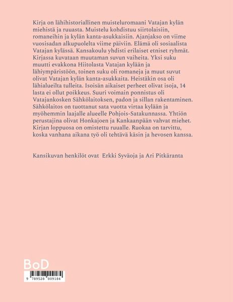 Kirja on lähihistoriallinen muisteluromaani Vatajan kylän miehistä ja ruuasta. Muistelu kohdistuu siirtolaisiin, romaneihin ja kylän kanta-asukkaisiin. Ajanjakso on viime vuosisadan alkupuolelta viime päiviin. Elämä oli sosiaalista Vatajan kylässä. Kansakoulu yhdisti erilaiset etniset ryhmät. Kirjassa kuvataan muutaman suvun vaiheita. Yksi suku muutti evakkona Hiitolasta Vatajan kylään ja lähiympäristöön, toinen suku oli romaneja ja muut suvut olivat Vatajan kylän kanta-asukkaita. Heistäkin osa oli lähialueilta tulleita. Isoisän aikaiset perheet olivat isoja, 14 lasta ei ollut poikkeus. Suuri voimain ponnistus oli Vatajankosken Sähkölaitoksen, padon ja sillan rakentaminen. Sähkölaitos on tuottanut sata vuotta virtaa kylään ja myöhemmin laajalle alueelle Pohjois-Satakunnassa. Yhtiön perustajina olivat Honkajoen ja Kankaanpään vahvat miehet. Kirjan loppuosa on omistettu ruualle. Ruokaa on tarvittu, koska vanhana aikana työ oli tehtävä käsin ja hevosen kanssa.