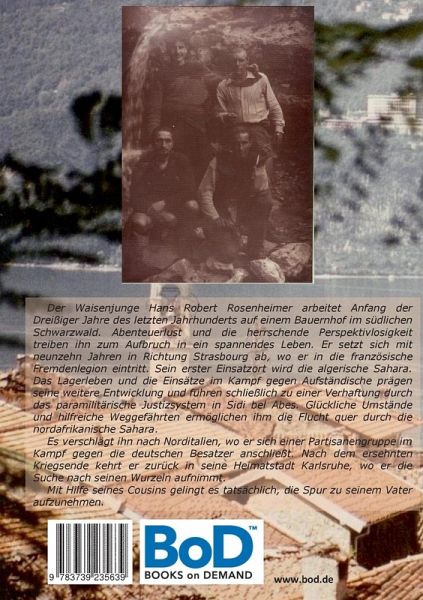 Der Waisenjunge Hans Robert Rosenheimer arbeitet Anfang der 1930er Jahre auf einem Bauernhof im südlichen Schwarzwald. Abenteuerlust und die herrschende Perspektivlosigkeit treiben ihn zum Aufbruch in ein spannendes Leben. Er setzt sich mit neunzehn Jahren in Richtung Strasbourg ab, wo er in die französische Fremdenlegion eintritt. Sein erster Einsatzort wird die algerische Sahara. Das Lagerleben und die Einsätze im Kampf gegen Aufständische prägen seine weitere Entwicklung und führen schließlich zu einer Verhaftung durch das paramilitärische Justizsystem in Sidi bel Abes. Glückliche Umstände und hilfreiche Weggefährten ermöglichen ihm die Flucht quer durch die nordafrikanische Sahara.Es verschlägt ihn nach Norditalien, wo er sich einer Partisanengruppe im Kampf gegen die deutschen Besatzer anschließt. Nach dem ersehnten Kriegsende kehrt er zurück in seine Heimatstadt Karlsruhe, wo er die Suche nach seinen Wurzeln aufnimmt.Mit Hilfe seines Cousins gelingt es tatsächlich, die Spurzu seinem Vater aufzunehmen.