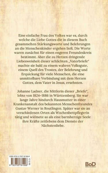 Eine einfache Frau des Volkes war es, durch welche die Liebe Gottes die in diesem Buch gesammelten Stärkungsworte und Belehrungen an die Menschenkinder ergehen ließ. Die Worte waren zunächst für einen engeren Freundeskreis bestimmt. Aber die zu Herzen dringende Liebesweisheit dieser schlichten 'Vaterbriefe' machte sie bald zu einem wahren Volksgute, einem Quell des Trostes, der Belehrung und Erquickung für viele Menschen, die eine unmittelbare Verbindung mit dem Herzen Gottes, dem Vater in Jesus, ersehnten.