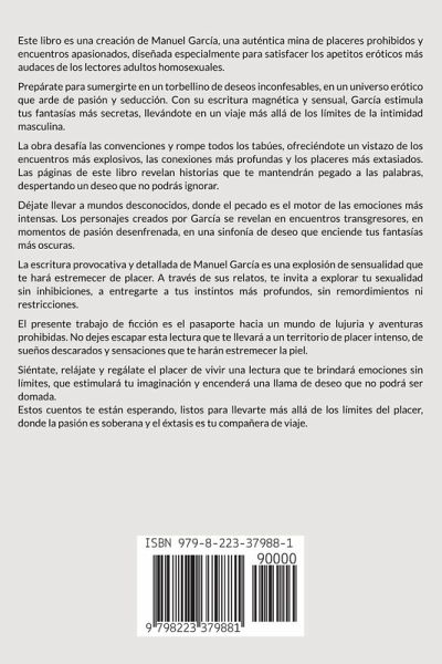 Este libro es una creación de Manuel García, una auténtica mina de placeres prohibidos y encuentros apasionados, diseñada especialmente para satisfacer los apetitos eróticos más audaces de los lectores adultos homosexuales. Prepárate para sumergirte en un torbellino de deseos inconfesables, en un universo erótico que arde de pasión y seducción. Con su escritura magnética y sensual, García estimula tus fantasías más secretas, llevándote en un viaje más allá de los límites de la intimidad masculina. La obra desafía las convenciones y rompe todos los tabúes, ofreciéndote un vistazo de los encuentros más explosivos, las conexiones más profundas y los placeres más extasiados. Las páginas de este libro revelan historias que te mantendrán pegado a las palabras, despertando un deseo que no podrás ignorar. Déjate llevar a mundos desconocidos, donde el pecado es el motor de las emociones más intensas. Los personajes creados por García se revelan en encuentros transgresores, en momentos de pasión desenfrenada, en una sinfonía de deseo que enciende tus fantasías más oscuras. La escritura provocativa y detallada de Manuel García es una explosión de sensualidad que te hará estremecer de placer. A través de sus relatos, te invita a explorar tu sexualidad sin inhibiciones, a entregarte a tus instintos más profundos, sin remordimientos ni restricciones. El presente trabajo de ficción es el pasaporte hacia un mundo de lujuria y aventuras prohibidas. No dejes escapar esta lectura que te llevará a un territorio de placer intenso, de sueños descarados y sensaciones que te harán estremecer la piel. Siéntate, relájate y regálate el placer de vivir una lectura que te brindará emociones sin límites, que estimulará tu imaginación y encenderá una llama de deseo que no podrá ser domada. Estos cuentos te están esperando, listos para llevarte más allá de los límites del placer, donde la pasión es soberana y el éxtasis es tu compañera de viaje.