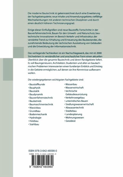 Das Fachlexikon Bauingenieurwesen bietet einen umfassenden, aktuellen Überblick über die gesamte Bautechnik und ihre Randgebiete. Rund 2500 Stichwörter werden verständlich, übersichtlich und mit zahlreichen Abbildungen anschaulich beschrieben. Die 2. Auflage ist aktualisiert und überarbeitet und informiert zusätzlich über die Fortschritte in der Baustoffkunde, Bauinformatik, Infrastruktur und den Verkehrswegebau, den Einfluß von Umweltfaktoren einschließlich Energiesparmaßnahmen sowie die sich daraus ergebenden baurechtlichen Probleme und die Qualitätssicherung.