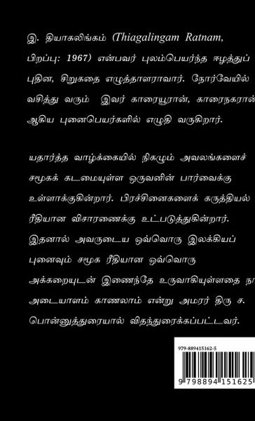 Due to the lack of geographical and political advantages to get our rights through armed struggle, people along with the Sri Lankan government strived to get our rights little by little without falling into violent disaster and to save the country and the Tamil people from disaster. They cornered as opportunists, traitors by some selfish politicians. Later so-called freedom movements went further and killed them for their own selfish interests. This is a novel that tends to talk about such non visionary ideas blind selfish politics that has brought us to this state. This is the story of a woman who suffered from this blind violence and left to find a solution to that. It tells an untold part of Eelam history.