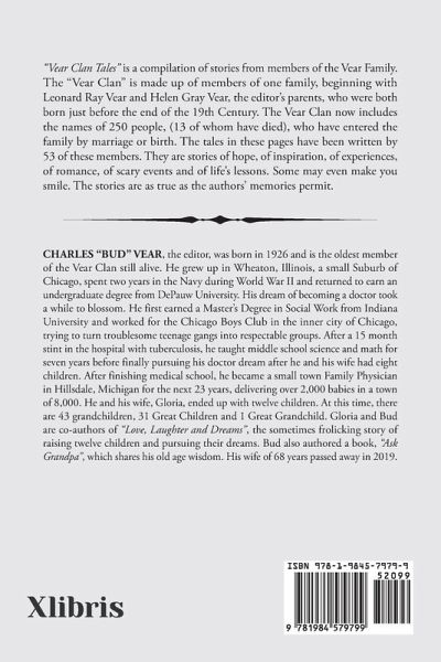 "Vear Clan Tales" is a compilation of stories from members of the Vear Family. The "Vear Clan" is made up of members of one family, beginning with Leonard Ray Vear and Helen Gray Vear, the editor's parents, who were both born just before the end of the 19th Century. The Vear Clan now includes the names of 250 people, (13 of whom have died), who have entered the family by marriage or birth. The tales in these pages have been written by 53 of these members. They are stories of hope, of inspiration, of experiences, of romance, of scary events and of life's lessons. Some may even make you smile. The stories are as true as the authors' memories permit.