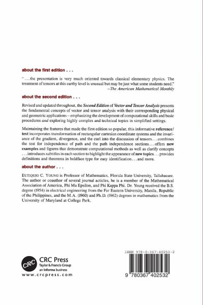 Revised and updated throughout, this book presents the fundamental concepts of vector and tensor analysis with their corresponding physical and geometric applications - emphasizing the development of computational skills and basic procedures, and exploring highly complex and technical topics in simplified settings.;This text: incorporates transformation of rectangular cartesian coordinate systems and the invariance of the gradient, divergence and the curl into the discussion of tensors; combines the test for independence of path and the path independence sections; offers new examples and figures that demonstrate computational methods, as well as carify concepts; introduces subtitles in each section to highlight the appearance of new topics; provides definitions and theorems in boldface type for easy identification. It also contains numerical exercises of varying levels of difficulty and many problems solved.