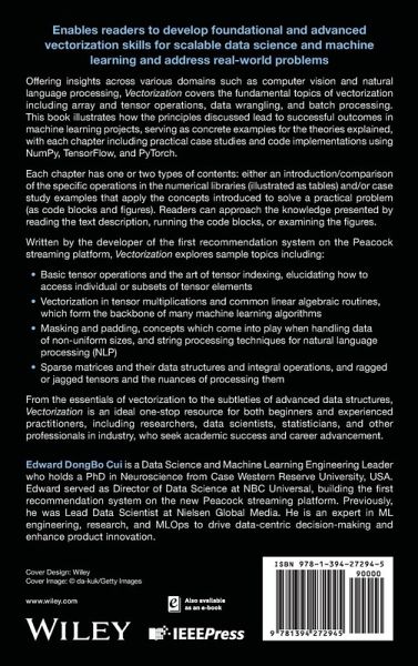 Enables readers to develop foundational and advanced vectorization skills for scalable data science and machine learning and address real-world problems Offering insights across various domains such as computer vision and natural language processing, Vectorization covers the fundamental topics of vectorization including array and tensor operations, data wrangling, and batch processing. This book illustrates how the principles discussed lead to successful outcomes in machine learning projects, serving as concrete examples for the theories explained, with each chapter including practical case studies and code implementations using NumPy, TensorFlow, and PyTorch. Each chapter has one or two types of contents: either an introduction/comparison of the specific operations in the numerical libraries (illustrated as tables) and/or case study examples that apply the concepts introduced to solve a practical problem (as code blocks and figures). Readers can approach the knowledge presented by reading the text description, running the code blocks, or examining the figures. Written by the developer of the first recommendation system on the Peacock streaming platform, Vectorization explores sample topics including: * Basic tensor operations and the art of tensor indexing, elucidating how to access individual or subsets of tensor elements * Vectorization in tensor multiplications and common linear algebraic routines, which form the backbone of many machine learning algorithms * Masking and padding, concepts which come into play when handling data of non-uniform sizes, and string processing techniques for natural language processing (NLP) * Sparse matrices and their data structures and integral operations, and ragged or jagged tensors and the nuances of processing them From the essentials of vectorization to the subtleties of advanced data structures, Vectorization is an ideal one-stop resource for both beginners and experienced practitioners, including researchers, data scientists, statisticians, and other professionals in industry, who seek academic success and career advancement.
