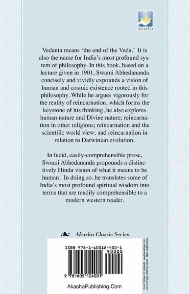 Vedanta means 'the end of the Veda.' It is also the name for India's most profound system of philosophy. In this book, based on a lecture given in 1901, Swami Abhedananda concisely and vividly expounds a vision of human and cosmic existence rooted in this philosophy. While he argues vigorously for the reality of reincarnation, which forms the keystone of his thinking, he also explores human nature and Divine nature; reincarnation in other religions; reincarnation and the scientific worldview; and reincarnation in relation to Darwinian evolution. In lucid, easily-comprehensible prose, Swami Abhedananda propounds a distinctively Hindu vision of what it means to be human. In doing so, he translates some of India's profoundest spiritual wisdom into terms that are readily comprehensible to a modern western reader.