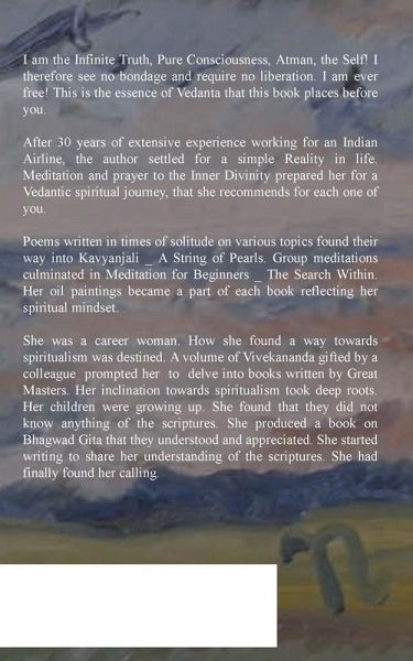It is my attempt to bring before you the magic of the Bharatvarsh spiritual essence. After we look at some essential Vedantic concepts of 'I am Infinite', 'The Divinity I Am', 'Why Vedanta' and Exclusivity to Inclusiveness; we get a cursory grip of the Vedas. Here 'What Vedanta Is', followed by 'The World is an Appearance' and 'Prakriti and the Three Gunas' together convey the intrinsic message of Vedanta to the reader to work towards the goal of life, which is to achieve Self Realisation in this life itself! Gurus from the authentic Vedantic tradition, steeped in the Upanishads and themselves Realised persons, left behind a legacy of talks, books and discourses, enabling the seeker come face to face with his Atman. Some of these stalwarts such as Swami Vivekananda, Ramana Maharishi, Swami Chinmayananda and Swami Tejomayananda are mentioned in interesting write-ups. Notes on Mantras, Fear and Maya bring further clarity to the reader's mind. The word Vedanta is explained as 'end of the Vedas', the Upanishads, the philosophical portion of the Vedas. The realisation that the Atman within each one, being the same as Brahman, was shared by Rishis with their disciples by word of mouth; till these experiences were put down on paper and became the Upanishads now available to us. I am pleased to offer my understanding of the Kathopanishad, Mandukya Upanishad, Kenopanishad and Bhagwad Gita Upanishad. Poems written by me, relevant to the subjects will hopefully delight the reader.
