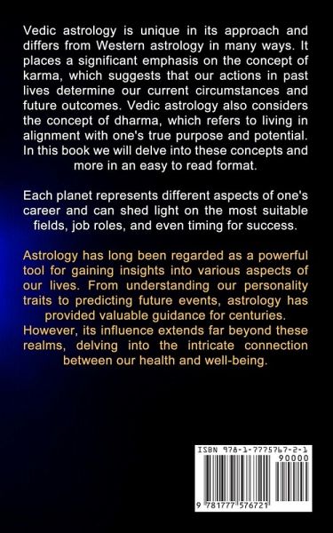 Vedic astrology is unique in its approach and differs from Western astrology in many ways. It places a significant emphasis on the concept of karma, which suggests that our actions in past lives determine our current circumstances and future outcomes. Vedic astrology also considers the concept of dharma, which refers to living in alignment with one's true purpose and potential. In this book we will delve into these concepts and more in an easy to read format. Each planet represents different aspects of one's career and can shed light on the most suitable fields, job roles, and even timing for success. Astrology has long been regarded as a powerful tool for gaining insights into various aspects of our lives. From understanding our personality traits to predicting future events, astrology has provided valuable guidance for centuries. However, its influence extends far beyond these realms, delving into the intricate connection between our health and well-being.