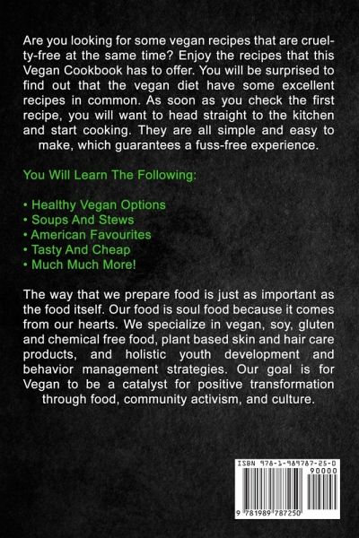 Are you looking for some vegan recipes that are cruelty-free at the same time? Enjoy the recipes that this Vegan Cookbook has to offer. You will be surprised to find out that the vegan diet have some excellent recipes in common. As soon as you check the first recipe, you will want to head straight to the kitchen and start cooking. They are all simple and easy to make, which guarantees a fuss-free experience. You Will Learn The Following: • Healthy Vegan Options • Soups And Stews • American Favourites • Tasty And Cheap • Much Much More! The way that we prepare food is just as important as the food itself. Our food is soul food because it comes from our hearts. We specialize in vegan, soy, gluten and chemical free food, plant based skin and hair care products, and holistic youth development and behavior management strategies. Our goal is for Vegan to be a catalyst for positive transformation through food, community activism, and culture. Don't Delay And Scroll Up To Buy With 1 Click