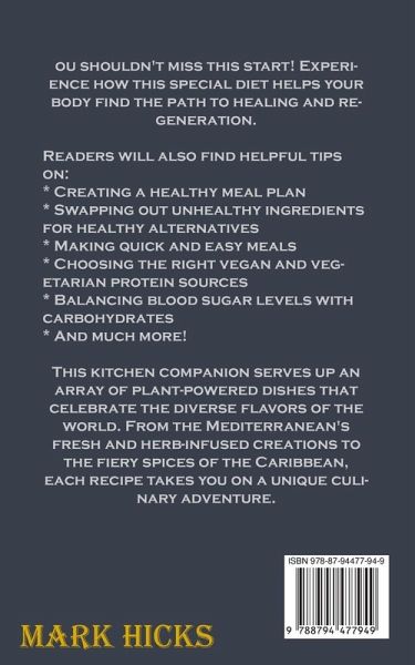 ou shouldn't miss this start! Experience how this special diet helps your body find the path to healing and regeneration. Readers will also find helpful tips on: * Creating a healthy meal plan * Swapping out unhealthy ingredients for healthy alternatives * Making quick and easy meals * Choosing the right vegan and vegetarian protein sources * Balancing blood sugar levels with carbohydrates * And much more! This kitchen companion serves up an array of plant-powered dishes that celebrate the diverse flavors of the world. From the Mediterranean's fresh and herb-infused creations to the fiery spices of the Caribbean, each recipe takes you on a unique culinary adventure.