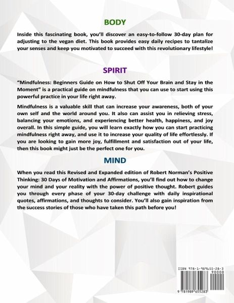 3 books in 1 for the BODY, SPIRIT & MINDl! BOOK 1 Are you curious about the vegan lifestyle? Do want to take care of your body - and the planet? Would you like to get healthy and build an attractive vegan body?If so, you must read Vegan: 30 Days of Vegan Recipes and Meal Plans for Increasing Your Health and Energy! You'll discover why you should go vegan NOW - and how to make this incredible diet work for you!Book 2"Mindfulness: Beginners Guide on How to Shut Off Your Brain and Stay in the Moment" is a practical guide on mindfulness that you can use to start using this powerful practice in your life right away.Mindfulness is a valuable skill that can increase your awareness, both of your own self and the world around you. It also can assist you in relieving stress, balancing your emotions, and experiencing better health, happiness, and joy overall. In this simple guide, you will learn exactly how you can start practicing mindfulness right away, and use it to increase your quality of life effortlessly. If you are looking to gain more joy, fulfillment and satisfaction out of your life, then this book might just be the perfect one for you.Book 3Are you living in constant fear? Are you becoming a pessimist and thought to yourself that this is not how you'd like to run your life? Do you want to experience freedom from pessimism?If you answered "yes"then this book is for you!It's an unpleasant place to be when someone thinks negatively all the time. When our mind starts thinking about negative thoughts, we realize that those thoughts usually take place in one's life. If it doesn't, a person would feel helpless and weak all the time.