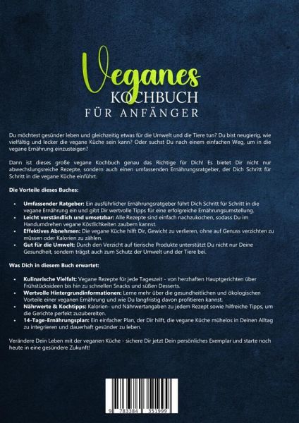 Du möchtest gesünder leben und gleichzeitig etwas für die Umwelt und die Tiere tun? Du bist neugierig, wie vielfältig und lecker die vegane Küche sein kann? Oder suchst Du nach einem einfachen Weg, um in die vegane Ernährung einzusteigen?Dann ist dieses große vegane Kochbuch genau das Richtige für Dich! Es bietet Dir nicht nur abwechslungsreiche Rezepte, sondern auch einen umfassenden Ernährungsratgeber, der Dich Schritt für Schritt in die vegane Küche einführt.Die Vorteile dieses Buches:- Umfassender Ratgeber: Ein ausführlicher Ernährungsratgeber führt Dich Schritt für Schritt in die vegane Ernährung ein und gibt Dir wertvolle Tipps für eine erfolgreiche Ernährungsumstellung.- Leicht verständlich und umsetzbar: Alle Rezepte sind einfach nachzukochen, sodass Du im Handumdrehen vegane Köstlichkeiten zaubern kannst.- Effektives Abnehmen: Die vegane Küche hilft Dir, Gewicht zu verlieren, ohne auf Genuss verzichten zu müssen oder Kalorien zu zählen.- Gut für die Umwelt: Durch den Verzicht auf tierische Produkte unterstützt Du nicht nur Deine Gesundheit, sondern trägst auch zum Schutz der Umwelt und der Tiere bei.Was Dich in diesem Buch erwartet:- Kulinarische Vielfalt: Vegane Rezepte für jede Tageszeit - von herzhaften Hauptgerichten über Frühstücksideen bis hin zu schnellen Snacks und süßen Desserts.- Wertvolle Hintergrundinformationen: Lerne mehr über die gesundheitlichen und ökologischen Vorteile einer veganen Ernährung und wie Du langfristig davon profitieren kannst.- Nährwerte & Kochtipps: Kalorien- und Nährwertangaben zu jedem Rezept sowie hilfreiche Tipps, um die Gerichte perfekt zuzubereiten.- 14-Tage-Ernährungsplan: Ein einfacher Plan, der Dir hilft, die vegane Küche mühelos in Deinen Alltag zu integrieren und dauerhaft gesünder zu leben.Verändere Dein Leben mit der veganen Küche - sichere Dir jetzt Dein persönliches Exemplar und starte noch heute in eine gesündere Zukunft!