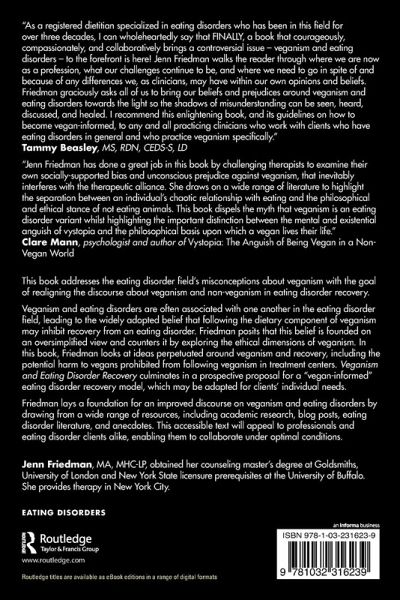 "As a registered dietitian specialized in eating disorders who has been in this field for over three decades, I can wholeheartedly say that FINALLY, a book that courageously, compassionately, and collaboratively brings a controversial issue - veganism and eating disorders - to the forefront is here! Jenn Friedman walks the reader through where we are now as a profession, what our challenges continue to be, and where we need to go in spite of and because of any differences we, as clinicians, may have within our own opinions and beliefs. Friedman graciously asks all of us to bring our beliefs and prejudices around veganism and eating disorders towards the light so the shadows of misunderstanding can be seen, heard, discussed, and healed. I recommend this enlightening book, and its guidelines on how to become vegan-informed, to any and all practicing clinicians who work with clients who have eating disorders in general and who practice veganism specifically."