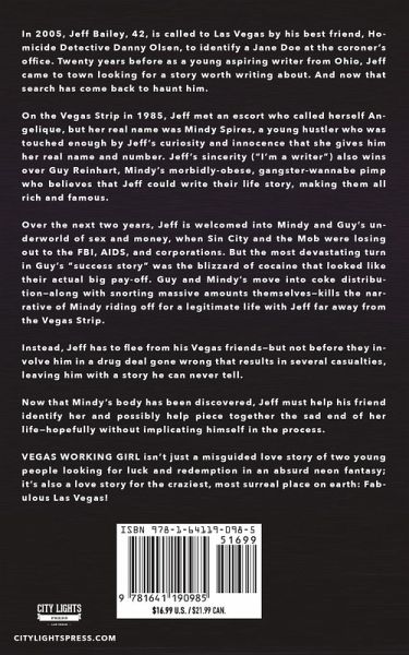 In 2005, Jeff Bailey, 42, is called to Las Vegas by his best friend, Homicide Detective Danny Olsen, to identify a Jane Doe at the coroner's office. Twenty years before as a young aspiring writer from Ohio, Jeff came to town looking for a story worth writing about. And now that search has come back to haunt him. On the Vegas Strip in 1985, Jeff met an escort who called herself Angelique, but her real name was Mindy Spires, a young hustler who was touched enough by Jeff's curiosity and innocence that she gives him her real name and number. Jeff's sincerity ("I'm a writer") also wins over Guy Reinhart, Mindy's morbidly-obese, gangster-wannabe pimp who believes that Jeff could write their life story, making them all rich and famous. Over the next two years, Jeff is welcomed into Mindy and Guy's underworld of sex and money, when Sin City and the Mob were losing out to the FBI, AIDS, and corporations. But the most devastating turn in Guy's "success story" was the blizzard of cocaine that looked like their actual big pay-off. Guy and Mindy's move into coke distribution-along with snorting massive amounts themselves-kills the narrative of Mindy riding off for a legitimate life with Jeff far away from the Vegas Strip. Instead, Jeff has to flee from his Vegas friends-but not before they involve him in a drug deal gone wrong that results in several casualties, leaving him with a story he can never tell. Now that Mindy's body has been discovered, Jeff must help his friend identify her and possibly help piece together the sad end of her life-hopefully without implicating himself in the process. VEGAS WORKING GIRL isn't just a misguided love story of two young people looking for luck and redemption in an absurd neon fantasy; it's also a love story for the craziest, most surreal place on earth: Fabulous Las Vegas!