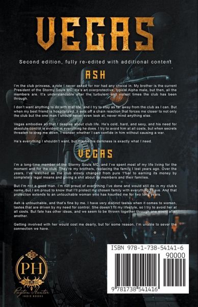 Ash I'm the club princess, a role I never asked for nor had any choice in. My brother is the current President of the Stormy Souls MC. He's an overprotective, typical Alpha male, but then, all the members are. It's understandable after the turbulent and violent times the club has been through. I don't want anything to do with that life, and I try to stay as far away from the club as I can. But when my best friend is hospitalized, it sets off a chain reaction that forces me closer to not only the club but the one man I should never even look at, never mind anything else. Vegas embodies all that I despise about club life. He's cold, hard, and sexy, and his need for absolute control is evident in everything he does. I try to avoid him at all costs, but when secrets threaten to drag me down, I wonder whether I can confide in him without causing a war. He's everything I shouldn't want, but maybe his darkness is exactly what I need. VEGAS As a long-time member of the Stormy Souls MC, and I've spent most of my life living for the moment and the club. They're my brothers, replacing the family I lost years ago. Over the years, I've watched as the club slowly changed from pure 1% er to earning its money by completely legal means and giving a shit about its members and their families. But I'm not a good man. I'm not proud of everything I've done and would still do in my club's name, but I am proud to know that I'll protect my chosen family with everything I have. And that protection extends to an untouchable woman who has haunted me for two long years. Ash is untouchable, and that's fine by me. I have very distinct tastes when it comes to women, tastes that are driven by my need for control. She doesn't fit my lifestyle, so I try to avoid her at all costs. But fate has other ideas, and we seem to be thrown together through one event after another. Getting involved with her would cost me dearly, but for some reason, I'm unable to sever the connection we have.
