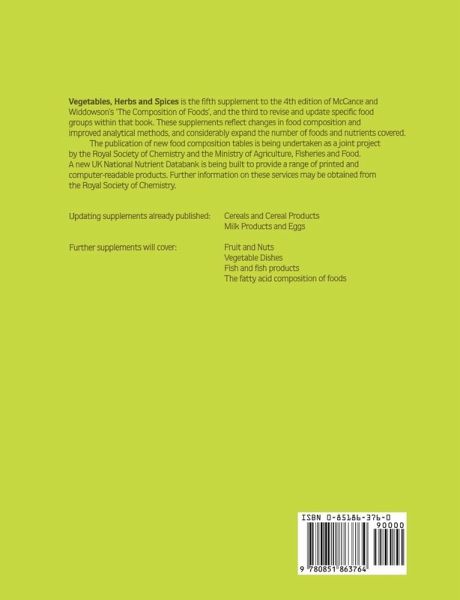 Vegetables, Herbs and Spices lists over 450 foods. The extensive new analytical results provide nutrient data for the wider variety of vegetable foods now eaten, including processed vegetables such as those canned and frozen, the increasingly popular 'exotic' vegetables like okra and mange-tout, and those cooked by modern methods such as stir-frying. Supplementary tables are included for fatty acid totals (for saturated, monounsaturated and polyunsaturated fats), new values for carotenoid fractions, and phytic acid, as well as a listing of taxonomic and alternative food names.