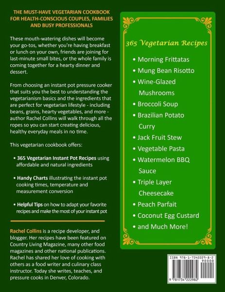 WHILE OTHER VEGETARIAN COOKBOOKS are poorly written, have no recipe index, lots of editing errors, bad recipes, or simply recipes that are overcomplicated, the Vegetarian Cookbook by Rachel Collins feature the best variety of well-thought-out and well-tested plant-based recipes you should expect with nutrition facts for every recipe in the book and comes with the well-structured recipe index. It includes the detailed information on vegetarianism, instructions on how to use your instant pot, perfect cookbook for beginners and pro instant pot users. WE ARE REAL PEOPLE who use our own recipes for…mehr