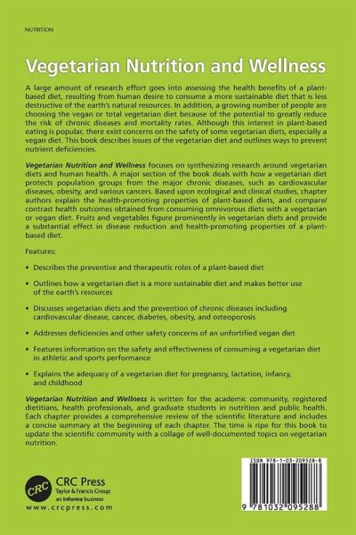 A large amount of research effort goes into assessing the health benefits of a plant-based diet, resulting from human desire to consume a more sustainable diet that is less destructive of the earth's natural resources. In addition, a growing number of people are choosing the vegan or total vegetarian diet because of the potential to greatly reduce the risk of chronic diseases and mortality rates. Although this interest in plant-based eating is popular, there exist concerns on the safety of some vegetarian diets, especially a vegan diet. This book describes issues of the vegetarian diet and outlines ways to prevent nutrient deficiencies. Vegetarian Nutrition and Wellness focuses on synthesizing research around vegetarian diets and human health. A major section of the book deals with how a vegetarian diet protects population groups from the major chronic diseases, such as cardiovascular diseases, obesity, and various cancers. Based upon ecological and clinical studies, chapter authors explain the health-promoting properties of plant-based diets, and compare/contrast health outcomes obtained from consuming omnivorous diets with a vegetarian or vegan diet. Fruits and vegetables figure prominently in vegetarian diets and provide a substantial effect in disease reduction and health-promoting properties of a plant-based diet. Vegetarian Nutrition and Wellness is written for the academic community, registered dietitians, health professionals, and graduate students in nutrition and public health. Each chapter provides a comprehensive review of the scientific literature and includes a concise summary at the beginning of each chapter. The time is ripe for this book to update the scientific community with a collage of well-documented topics on vegetarian nutrition.
