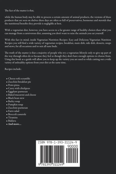 The fact of the matter is that, while the human body may be able to process a certain amount of animal products, the versions of these products that are seen on shelves these days are often so full of preservatives, hormones and steroids that the nutritional benefits they provide is negligible at best. With a vegetarian diet, however, you have access to a far greater range of healthy choices than what you can manage from a carnivorous diet, assuming you don't want to raise the animals you eat yourself. With this fact in mind, inside Vegetarian Nutrition Recipes: Easy and Delicious Vegetarian Nutrition Recipes you will find a wide variety of vegetarian recipes, breakfast, main dish, side dish, desserts, soups and stews, for all occasions and to suit all taste buds. The truth of the matter is that a majority of people who try a vegetarian lifestyle only to give up part of the way through often do so because they feel as though they don't have enough options to choose from. Using this book as a guide will allow you to keep up the variety you are used to while cutting out a wide variety of unhealthy options from your diet at the same time. Recipes include: Cheesy tofu scramble Zucchini breakfast pie Pesto pizza Curry with chickpeas Eggplant parmesan Baked macaroni and cheese Black bean stew Barley soup Pumpkin soup Zucchini parmesan Farro salad Broccoli casserole Tiramisu Baklava And more…