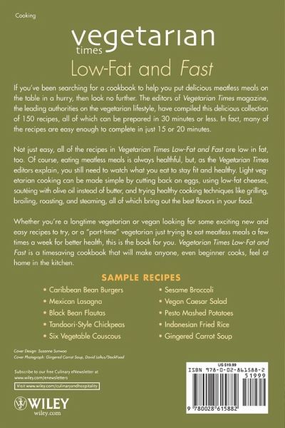 Vegetarian Times Low-Fat and Fast If you've been searching for a cookbook to help you put delicious meatless meals on the table in a hurry, then look no further. The editors of Vegetarian Times magazine, the leading authorities on the vegetarian lifestyle, have compiled this delicious collection of 150 recipes, all of which can be prepared in 30 minutes or less. In fact, many of the recipes are easy enough to complete in just 15 or 20 minutes. Not just easy, all of the recipes in Vegetarian Times Low-Fat and Fast are low in fat, too. Of course, eating meatless meals is always healthful, but, as the Vegetarian Times editors explain, you still need to watch what you eat to stay fit and healthy. Light vegetarian cooking can be made simple by cutting back on eggs, using low-fat cheeses, sauteing with olive oil instead of butter, and trying healthy cooking techniques like grilling, broiling, roasting, and steaming, all of which bring out the best flavors in your food. Whether you're a longtime vegetarian or vegan looking for some exciting new and easy recipes to try, or a "part-time" vegetarian just trying to eat meatless meals a few times a week for better health, this is the book for you. Vegetarian Times Low-Fat and Fast is a timesaving cookbook that will make anyone, even beginner cooks, feel at home in the kitchen. Sample Recipes * Caribbean Bean Burgers * Sesame Broccoli * Mexican Lasagna * Vegan Caesar Salad * Black Bean Flautas * Pesto Mashed Potatoes * Tandoori-Style Chickpeas * Indonesian Fried Rice * Six Vegetable Couscous * Gingered Carrot Soup