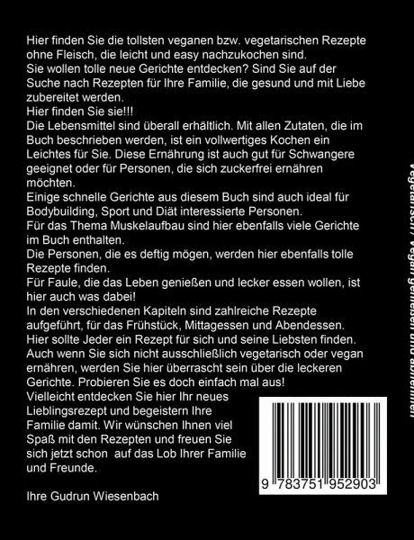 Hier finden Sie die tollsten veganen bzw. vegetarischen Rezepte ohne Fleisch, die leicht und easy nachzukochen sind.Sie wollen tolle neue Gerichte entdecken? Sind Sie auf der Suche nach Rezepten für Ihre Familie, die gesund und mit Liebe zubereitet werden. Hier finden Sie sie!!!Die Lebensmittel sind überall erhältlich. Mit allen Zutaten, die im Buch beschrieben werden, ist ein vollwertiges Kochen ein Leichtes für Sie. Diese Ernährung ist auch gut für Schwangere geeignet oder für Personen, die sich zuckerfrei ernähren möchten.Einige schnelle Gerichte aus diesem Buch sind auch ideal für Bodybuilding, Sport und Diät interessierte Personen.Für das Thema Muskelaufbau sind hier ebenfalls viele Gerichte im Buch enthalten.Die Personen, die es deftig mögen, werden hier ebenfalls tolle Rezepte finden.Für Faule, die das Leben genießen und lecker essen wollen, ist hier auch was dabei! In den verschiedenen Kapiteln sind zahlreiche Rezepte aufgeführt, für das Frühstück, Mittagessen und Abendessen.Hier sollte Jeder ein Rezept für sich und seine Liebsten finden. Auch wenn Sie sich nicht ausschließlich vegetarisch oder vegan ernähren, werden Sie hier überrascht sein über die leckeren Gerichte. Probieren Sie es doch einfach mal aus! Vielleicht entdecken Sie hier Ihr neues Lieblingsrezept und begeistern Ihre Familie damit. Wir wünschen Ihnen viel Spaß mit den Rezepten und freuen Sie sich jetzt schon auf das Lob Ihrer Familie und Freunde.IhreGudrun Wiesenbach Aus Kostengründen hat sich die Autorin dieses Buches bewusst dazu entschieden, nur die Rezepte nieder zu schreiben. Es gibt in diesem Buch keine Bilder der Gerichte, denn jeder Koch gestaltet seine Teller nach seinem Ermessen.Aus Erfahrung hat sie selber erlebt, dass Gerichte, die sie nachgekocht hat, aus anderen Büchern, nie wirklich so aussahen, wie auf den Abbildungen in den anderen Kochbüchern. Deshalb hat sie sich bewusst dazu entschieden, keine Beispiel-Bilder in dieses Buch aufzunehmen.