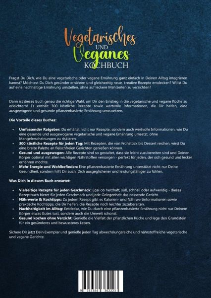 Fragst Du Dich, wie Du eine vegetarische oder vegane Ernährung ganz einfach in Deinen Alltag integrieren kannst? Möchtest Du Dich gesünder ernähren und gleichzeitig neue, kreative Rezepte entdecken? Willst Du auf eine nachhaltige Ernährung umstellen, ohne auf leckere Mahlzeiten zu verzichten?Dann ist dieses Buch genau die richtige Wahl, um Dir den Einstieg in die vegetarische und vegane Küche zu erleichtern! Es enthält 300 köstliche Rezepte sowie wertvolle Informationen, die Dir helfen, eine ausgewogene und gesunde pflanzenbasierte Ernährung umzusetzen.Die Vorteile dieses Buches:- Umfassender Ratgeber: Du erhältst nicht nur Rezepte, sondern auch wertvolle Informationen, wie Du eine gesunde und ausgewogene vegetarische und vegane Ernährung umsetzt, ohne Mangelerscheinungen zu riskieren.- 300 köstliche Rezepte für jeden Tag: Mit Rezepten, die von Frühstück bis Dessert reichen, wirst Du eine breite Palette an fleischfreien Gerichten genießen können.- Gesund und ausgewogen: Alle Rezepte sind so gestaltet, dass sie leicht zuzubereiten sind und Deinen Körper optimal mit allen wichtigen Nährstoffen versorgen - perfekt für jeden, der sich gesund und lecker ernähren möchte.- Mehr Energie und Wohlbefinden: Eine pflanzenbasierte Ernährung unterstützt nicht nur Deine Gesundheit, sondern hilft Dir auch, Dich ausgeglichener und leistungsfähiger zu fühlen.Was Dich in diesem Buch erwartet:- Vielseitige Rezepte für jeden Geschmack: Egal ob herzhaft, süß, schnell oder aufwendig - dieses Rezeptbuch bietet für jeden Geschmack und jede Gelegenheit das passende Gericht.- Nährwerte & Kochtipps: Zu jedem Rezept gibt es Kalorien- und Nährwertinformationen sowie praktische Kochtipps, die Dir helfen, die Rezepte noch leichter zuzubereiten.- Nachhaltigkeit im Alltag: Entdecke, wie Du durch eine pflanzenbasierte Ernährung nicht nur Deinem Körper etwas Gutes tust, sondern auch die Umwelt schonst.- Gesund kochen ohne Verzicht: Genieße die Vielfalt der pflanzlichen Küche und lege den Grundstein für ein gesünderes und bewussteres Leben.Sichere Dir jetzt Dein Exemplar und genieße jeden Tag abwechslungsreiche und nährstoffreiche vegetarische und vegane Gerichte.