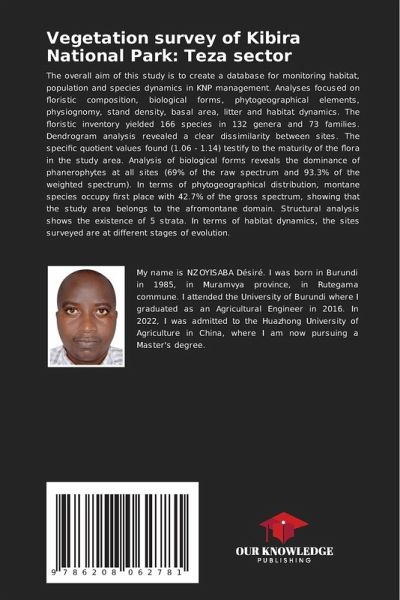 The overall aim of this study is to create a database for monitoring habitat, population and species dynamics in KNP management. Analyses focused on floristic composition, biological forms, phytogeographical elements, physiognomy, stand density, basal area, litter and habitat dynamics. The floristic inventory yielded 166 species in 132 genera and 73 families. Dendrogram analysis revealed a clear dissimilarity between sites. The specific quotient values found (1.06 - 1.14) testify to the maturity of the flora in the study area. Analysis of biological forms reveals the dominance of phanerophytes at all sites (69% of the raw spectrum and 93.3% of the weighted spectrum). In terms of phytogeographical distribution, montane species occupy first place with 42.7% of the gross spectrum, showing that the study area belongs to the afromontane domain. Structural analysis shows the existence of 5 strata. In terms of habitat dynamics, the sites surveyed are at different stages of evolution.