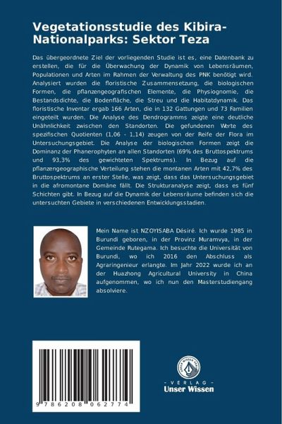 Das übergeordnete Ziel der vorliegenden Studie ist es, eine Datenbank zu erstellen, die für die Überwachung der Dynamik von Lebensräumen, Populationen und Arten im Rahmen der Verwaltung des PNK benötigt wird. Analysiert wurden die floristische Zusammensetzung, die biologischen Formen, die pflanzengeografischen Elemente, die Physiognomie, die Bestandsdichte, die Bodenfläche, die Streu und die Habitatdynamik. Das floristische Inventar ergab 166 Arten, die in 132 Gattungen und 73 Familien eingeteilt wurden. Die Analyse des Dendrogramms zeigte eine deutliche Unähnlichkeit zwischen den Standorten. Die gefundenen Werte des spezifischen Quotienten (1,06 - 1,14) zeugen von der Reife der Flora im Untersuchungsgebiet. Die Analyse der biologischen Formen zeigt die Dominanz der Phanerophyten an allen Standorten (69% des Bruttospektrums und 93,3% des gewichteten Spektrums). In Bezug auf die pflanzengeographische Verteilung stehen die montanen Arten mit 42,7% des Bruttospektrums an erster Stelle, was zeigt, dass das Untersuchungsgebiet in die afromontane Domäne fällt. Die Strukturanalyse zeigt, dass es fünf Schichten gibt. In Bezug auf die Dynamik der Lebensräume befinden sich die untersuchten Gebiete in verschiedenen Entwicklungsstadien.