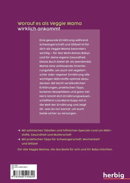 Veggie liegt im Trend! Doch funktioniert die rein pflanzliche Ernährungsweise auch in Schwangerschaft und Stillzeit? Ernährungswissenschaftlerin Lisa Kopp weiß um die Unsicherheiten vieler Veggie Mamas und sagt: Ja, das geht! In diesem Ratgeber zeigt sie, wie sich kritische Nährstoffe wie B12, Eisen und Co. während der Schwangerschaft ausgleichen lassen und räumt Unsicherheiten mit Hilfe neuester wissenschaftlicher Erkenntnisse aus dem Weg. Umfangreiche Lebensmitteltabellen und Nährstoffübersichten ergänzen das Buch. Für alle Veggie Mamas, die das Beste für sich und ihr Baby möchten.