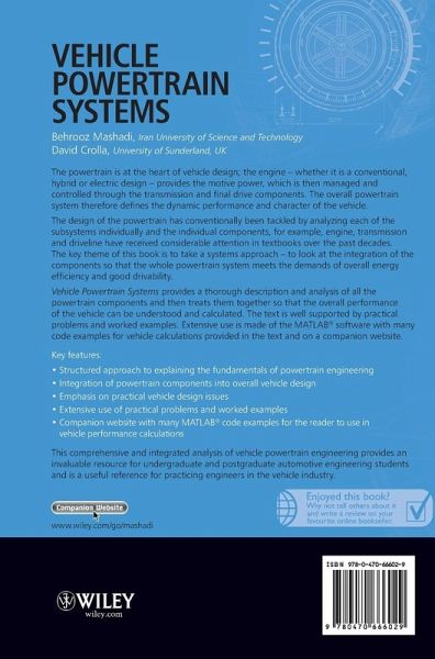 Vehicle Powertrain Systems The powertrain is at the heart of vehicle design; the engine - whether it is a conventional, hybrid or electric design - provides the motive power, which is then managed and controlled through the transmission and final drive components. The overall powertrain system therefore defines the dynamic performance and character of the vehicle. The design of the powertrain has conventionally been tackled by analyzing each of the subsystems individually and the individual components, for example, engine, transmission and driveline have received considerable attention in textbooks over the past decades. The key theme of this book is to take a systems approach - to look at the integration of the components so that the whole powertrain system meets the demands of overall energy efficiency and good drivability. Vehicle Powertrain Systems provides a thorough description and analysis of all the powertrain components and then treats them together so that the overall performance of the vehicle can be understood and calculated. The text is well supported by practical problems and worked examples. Extensive use is made of the MATLAB software and many example programmes for vehicle calculations are provided in the text. Key features: * Structured approach to explaining the fundamentals of powertrain engineering * Integration of powertrain components into overall vehicle design * Emphasis on practical vehicle design issues * Extensive use of practical problems and worked examples * Provision of MATLAB programmes for the reader to use in vehicle performance calculations This comprehensive and integrated analysis of vehicle powertrain engineering provides an invaluable resource for undergraduate and postgraduate automotive engineering students and is a useful reference for practicing engineers in the vehicle industry.
