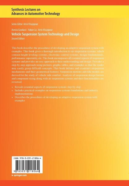 This book describes the procedures of developing an adaptive suspension system with examples. This book gives a thorough introduction to air suspension systems, which contain height leveling systems, electronic control systems, design fundamentals, performance superiority, etc. This book encompasses all essential aspects of suspension systems and provides an easy approach to their understanding and design. Provides a step-by-step approach using pictures, graphs, tables, and examples so that the reader may easily grasp difficult concepts. This book defines and examines suspension mechanisms and their geometrical features. Suspension motions and ride models are derived for the study of vehicle ride comfort. Analysis of suspension design factors and component sizing along with air suspension systems and their functionalities are reviewed.