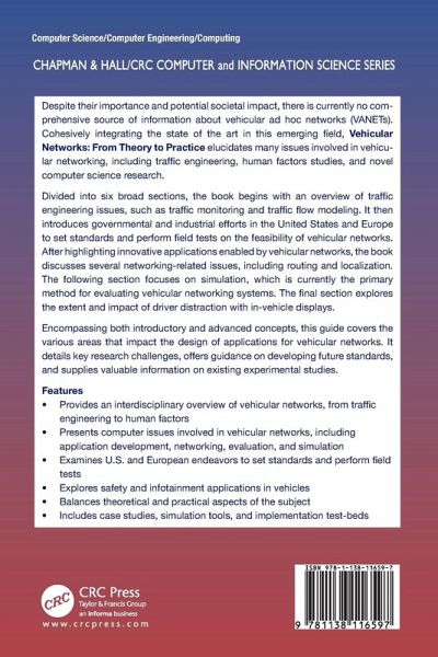 In spite of their importance and potential societal impact, there is currently no comprehensive source of information about vehicular ad hoc networks (VANETs). Cohesively integrating the state of the art in this emerging field, Vehicular Networks: From Theory to Practice elucidates many issues involved in vehicular networking, including traffic engineering, human factors studies, and novel computer science research. Divided into six broad sections, the book begins with an overview of traffic engineering issues, such as traffic monitoring and traffic flow modeling. It then introduces governmental and industrial efforts in the United States and Europe to set standards and perform field tests on the feasibility of vehicular networks. After highlighting innovative applications enabled by vehicular networks, the book discusses several networking-related issues, including routing and localization. The following section focuses on simulation, which is currently the primary method for evaluating vehicular networking systems. The final part explores the extent and impact of driver distraction with in-vehicle displays. Encompassing both introductory and advanced concepts, this guide covers the various areas that impact the design of applications for vehicular networks. It details key research challenges, offers guidance on developing future standards, and supplies valuable information on existing experimental studies.
