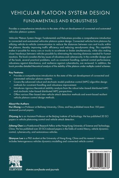Vehicular Platoon System Design: Fundamentals and Robustness provides a comprehensive introduction to connected and automated vehicular platoon system design. Platoons decrease the distances between cars or trucks using electronic, and possibly mechanical, coupling. This capability allows many cars or trucks to accelerate or brake simultaneously. It also allows for a closer headway between vehicles by eliminating reacting distance needed for human reaction. The book considers the key issues of robustness and cybersecurity, with optimization-based model predictive control schemes applied to control vehicle platoon. In the controller design part, several practical problems, such as constraint handling, optimal control performance, robustness against disturbance, and resilience against cyberattacks are reviewed. In addition, the book provides detailed theoretical analysis of the stability of the platoon under different control schemes.
