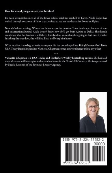 How far would you go to save your brother? It's been six months since all of the lower orbital satellites crashed to Earth. Akule Lopez has waited through every one of those days...waited to see her brother arrive home in Alpine. Now she's done waiting. Winter has fallen across the desolate Texas landscape. Rumors of war and insurrection abound. Akule doesn't know how she'll get from Alpine to Dallas. She doesn't even know that her brother is still there. But she does know that she's going to find out. Her father doesn't want her to go, but Akule isn't a child anymore. She doesn't need her father's permission. She also understands that if she goes, if she dies in the attempt, then her father will have lost both of his children. She won't let that happen. If it's the last thing she ever does, she will find Paco and bring him home. What sacrifice is too big, when it seems your life has been draped in a Veil of Destruction? From USA Today Bestselling author Vannetta Chapman comes a survival series unlike any other. Veil of Destruction is book three in a new post-apocalyptic survival thriller series from USA Today Bestselling Author Vannetta Chapman. An exciting contribution to the genre of disaster fiction, this is a series that will keep you reading late into the night. Kessler Effect Series Prequel: Veil of Mystery Book 1: Veil of Anarchy Book 2: Veil of Confusion Book 3: Veil of Destruction Book 4: Veil of Stillness