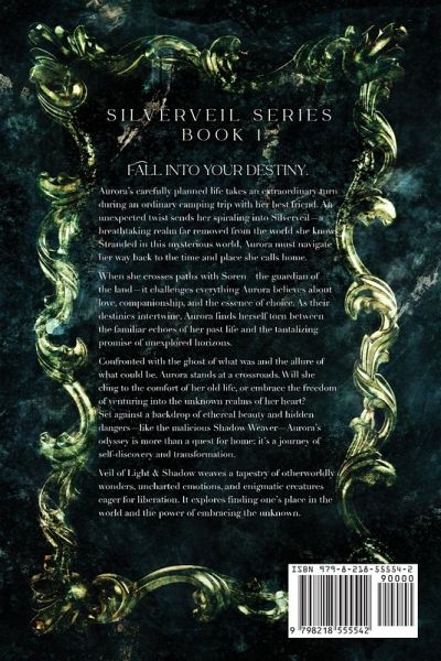 Silverveil Series, Book 1 Fall into your destiny. Aurora's carefully planned life takes an extraordinary turn during an ordinary camping trip with her best friend. An unexpected twist sends her spiraling into Silverveil-a breathtaking realm far removed from the world she knows. Stranded in this mysterious world, Aurora must navigate her way back to the time and place she calls home. When she crosses paths with Soren-the guardian of the land-it challenges everything Aurora believes about love, companionship, and the essence of choice. As their destinies intertwine, Aurora finds herself torn between the familiar echoes of her past life and the tantalizing promise of unexplored horizons. Confronted with the ghost of what was and the allure of what could be, Aurora stands at a crossroads. Will she cling to the comfort of her old life, or embrace the freedom of venturing into the unknown realms of her heart? Set against a backdrop of ethereal beauty and hidden dangers-like the malicious Shadow Weaver-Aurora's odyssey is more than a quest for home; it's a journey of self-discovery and transformation. Veil of Light & Shadow weaves a tapestry of otherworldly wonders, uncharted emotions, and enigmatic creatures eager for liberation. It explores finding one's place in the world and the power of embracing the unknown. Please note: This is an adult fantasy romance series with sensitive elements.