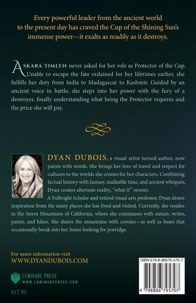 Every powerful leader from the ancient world to the present day has craved the Cup of the Shining Sun's immense power-it exalts as readily as it destroys. Askara Timlen never asked for her role as Protector of the Cup. Unable to escape the fate ordained for her lifetimes earlier, she fulfills her duty from India to Madagascar to Kashmir. Guided by an ancient voice in battle, she steps into her power with the fury of a destroyer, finally understanding what being the Protector requires and the price she will pay.