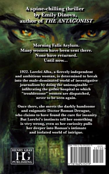 Morning Falls Asylum. Many women have been sent there. None have returned. Until now... 1922. Lorelei Alba, a fiercely independent and ambitious woman, is determined to break into the male-dominated world of investigative journalism by doing the unimaginable: infiltrating the gothic hospital to which "troublesome" women are dispatched, never to be seen again. Once there, she meets the darkly handsome and enigmatic Doctor Roman Dreugue, who claims to have found the cure to insanity. But Lorelei's instincts tell her something is very wrong, even as her curiosity pulls her deeper into Roman's intimate and isolated world of intrigue.