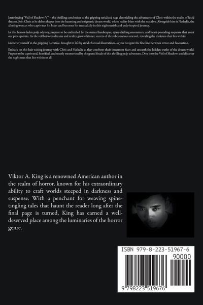 Introducing "Veil of Shadows V" - the thrilling conclusion to the gripping serialized saga chronicling the adventures of Chris within the realm of lucid dreams. Join Chris as he delves deeper into the haunting and enigmatic dream world, where reality blurs with the macabre. Alongside him is Nathalie, the alluring woman who captivates his heart and becomes his trusted ally in this nightmarish and pulp-inspired journey. In this horror-laden pulp odyssey, prepare to be enthralled by the surreal landscapes, spine-chilling encounters, and heart-pounding suspense that await our protagonists. As the veil between dreams and reality grows thinner, secrets of the subconscious unravel, revealing the darkness that lies within. Immerse yourself in the gripping narrative, brought to life by vivid charcoal illustrations, as you navigate the fine line between terror and fascination. Embark on this hair-raising journey with Chris and Nathalie as they confront their innermost fears and unearth the hidden truths of the dream world. Prepare to be captivated, horrified, and utterly mesmerized by the grand finale of this thrilling pulp adventure. Dive into the Veil of Shadows and discover the nightmare that lies within us all.