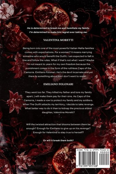 STANDALONE in a dark mafia romance series. He is determined to break me and humiliate my family. I'm determined to make him regret ever taking me. Valentina Moretti Being born into one of the most powerful Italian Mafia families comes with expectations. For a woman? It means marrying someone who would benefit the Outfit. I am expected to fall in line and follow the rules. What if that's not what I want? Maybe I'm not meant to yearn for my own freedom because the punishment comes in the form of the ruthless Capo of the Camorra. Emiliano Folonari. He's the devil incarnate and yet there is something about him I don't want to resist... Emiliano Folonari They went too far. They killed my father and tore my family apart. I will make them pay for their sins. As Capo of the Camorra, I made a vow to protect my family and my soldiers. When The Outfit attacks my territory, I decide to take revenge. What better way to do it than to kidnap the precious eldest daughter, Valentina Moretti? Will the twisted attraction that blooms between them be enough? Enough for Emiliano to give up on his revenge? Enough for Valentina to stay true to herself? Or will it break them both?