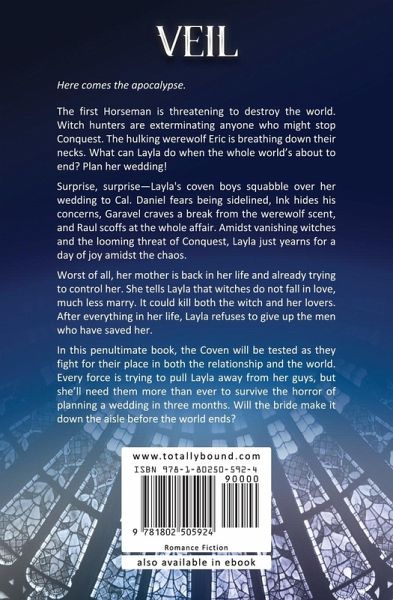 Here comes the apocalypse. The first Horseman is threatening to destroy the world. Witch hunters are exterminating anyone who might stop Conquest. The hulking werewolf Eric is breathing down their necks. What can Layla do when the whole world's about to end? Plan her wedding! Surprise, surprise-the coven boys are starting fights about her marrying Cal. Daniel's afraid he could be pushed out. Ink would never admit that he's worried she'll move beyond him. Garavel just wants to get away from the wet dog smell. As for the ex-witch hunter Raul, he declares the whole idea ludicrous. Witches are vanishing across the world and Conquest is definitely to blame, but no one knows yet how to stop him. Everyone expects Layla to put her life aside to save the world. All she wants is one day to be happy. Worst of all, her mother is back in her life and already trying to control her. She tells Layla that witches do not fall in love, much less marry. It could kill both the witch and her lovers. After everything in her life, Layla refuses to give up the men who have saved her. In this penultimate book, the Coven will be tested as they fight for their place in both the relationship and the world. Every force is trying to pull Layla away from her guys, but she'll need them more than ever to survive the horror of planning a wedding in three months. Will the bride make it down the aisle before the world ends?