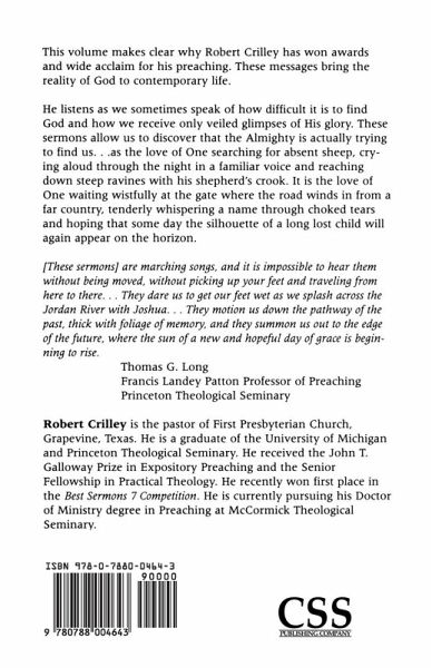 This volume makes clear why Robert Crilley has won awards and wide acclaim for his preaching. These messages bring the reality of God to contemporary life. He listens as we sometimes speak of how difficult it is to find God and how we receive only veiled glimpses of His glory. These sermons allow us to discover that the Almighty is actually trying to find us... as the love of One searching for absent sheep, crying aloud through the night in a familiar voice and reaching down steep ravines with his shepherd's crook. It is the love of One waiting wistfully at the gate where the road winds in from a far country, tenderly whispering a name through choked tears and hoping that some day the silhouette of a long lost child will again appear on the horizon. [These sermons] are marching songs, and it is impossible to hear them without being moved, without picking up your feet and traveling from here to there... They dare us to get our feet wet as we splash across the Jordan River with Joshua... They motion us down the pathway of the past, thick with foliage of memory, and they summon us out to the edge of the future, where the sun of a new and hopeful day of grace is beginning to rise. Thomas G. Long Francis Landey Patton Professor of Preaching Princeton Theological Seminary Robert Crilley is the pastor of First Presbyterian Church, Grapevine, Texas. He is a graduate of the University of Michigan and Princeton Theological Seminary. He received the John T. Galloway Prize in Expository Preaching and the Senior Fellowship in Practical Theology. He recently won first place in the Best Sermons 7 Competition. He is currently pursuing his Doctor of Ministry degree in Preaching at McCormick Theological Seminary.
