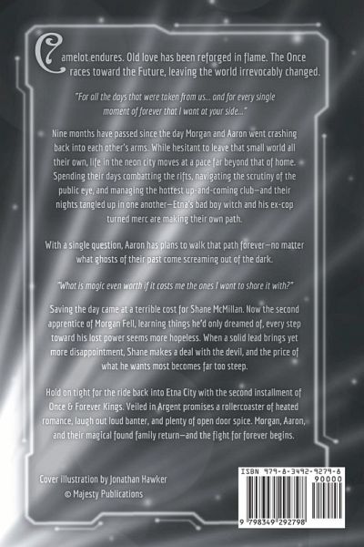 Camelot endures. Old love has been reforged in flame. The Once races toward the Future, leaving the world irrevocably changed. "For all the days that were taken from us... and for every single moment of forever that I want at your side..." Nine months have passed since the day Morgan and Aaron went crashing back into each other's arms. While hesitant to leave that small world all their own, life in the neon city moves at a pace far beyond that of home. Spending their days combatting the rifts, navigating the scrutiny of the public eye, and managing the hottest up-and-coming club-and their nights tangled up in one another-Etna's bad boy witch and his ex-cop turned merc are making their own path. With a single question, Aaron has plans to walk that path forever-no matter what ghosts of their past come screaming out of the dark. "What is magic even worth if it costs me the ones I want to share it with?" Saving the day came at a terrible cost for Shane McMillan. Now the second apprentice of Morgan Fell, learning things he'd only dreamed of, every step toward his lost power seems more hopeless. When a solid lead brings yet more disappointment, Shane makes a deal with the devil, and the price of what he wants most becomes far too steep. Hold on tight for the ride back into Etna City with the second installment of Once & Forever Kings. Veiled in Argent promises a rollercoaster of heated romance, laugh out loud banter, and plenty of open door spice. Morgan, Aaron, and their magical found family return-and the fight for forever begins.