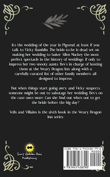 It's the wedding of the year in Pigsend, at least if you talk to Vicky Hamblin. The bride-to-be is dead set on making her wedding to baker Allen Mackey the most perfect spectacle in the history of weddings, if only to impress her two snooty aunts in from Middleburg. Bev's in charge of hosting them at the Weary Dragon Inn, along with a carefully-curated list of other family members, all designed to impress. But when things start going awry, and Vicky suspects someone might be out to sabotage her wedding, Bev's on the case once more. Can she find out who's out to get the bride before the big day? Veils and Villains is the sixth book in the Weary Dragon Inn series.