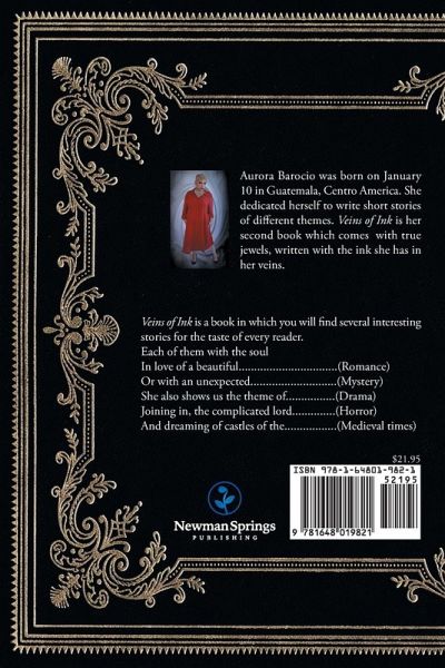 Aurora Barocio was born in January 10 in Guatemala, Central America. She dedicated herself to write short stories of different themes. Veins of Ink is her second book, which comes with true jewels, written with the ink she has in her veins. Veins of Ink is a book in which you will find several interesting stories for the taste of every reader. Each of them with the soul In love of a beautiful_________________________________ (romance) or with an unexpected______________________________(mystery) She also shows us the theme of____________________(drama) joining in the complicated Lord__________________(horror) and dreaming of castles of the____________________(medieval times)